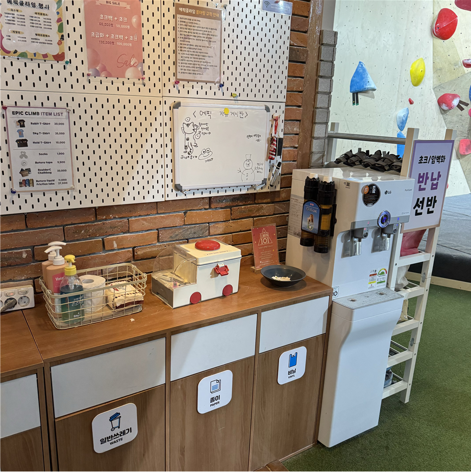 먼저 입구를 딱 들어서면, 정수기와 기본 상처소독 용품이 있고, 클라이밍티와 음료를 팔고 있습니다. ㅎㅎ